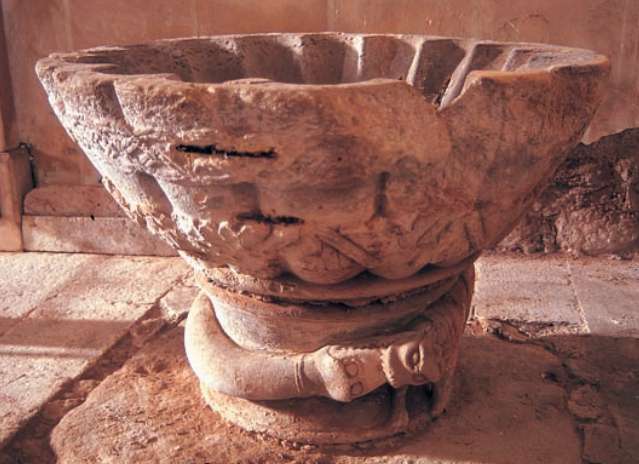 EL INTERIOR: PILA BAUTISMAL. En el interior veremos una pila bautismal, de 127 cm de diámetro y 50 cm de altura, con decoración vegetal en el exterior, una escena de lucha entre una serpiente y un león y dos serpientes mordiéndose las cabezas.