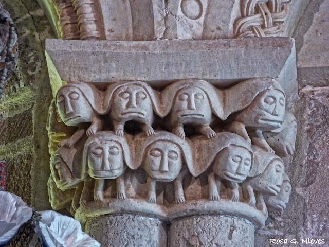 CAPITELES DEL EXTERIOR: EL DIOS CELTA OGMIOS. Los capiteles del ábside representan máscaras de cuya boca salen serpientes y leones o perros devorando una presa.